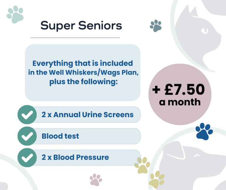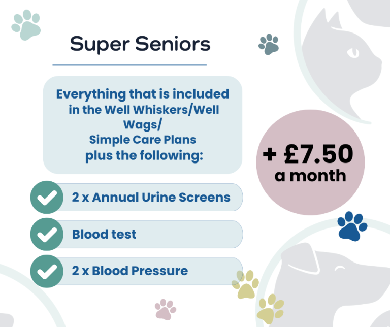 An Add-on to any of our other plans. As our pets get older, their risk of disease increases. By making your plan a Super Senior one, we can do screening tests to pick up early indications of disease processes and give your pet the best chance of a long and happy life by acting early.