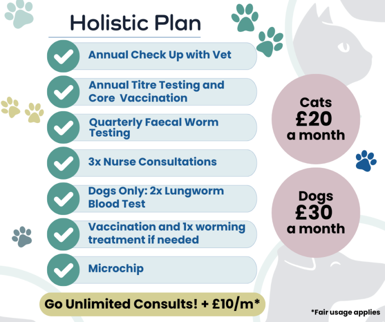 We understand that not everyone feels comfortable with vaccinating their pet if they don't need to. Same for flea and worming treatment. Our holistic plan checks whether your pet needs to be vaccinated by performing titre testing and then covers the vaccine if they do. Not all vaccines can be titre tested and so we cover these for you. If you do choose our holistic plan please check with your insurer that they are happy with titre testing as for some it will invalidate your insurance if you don't follow annual vaccinations.